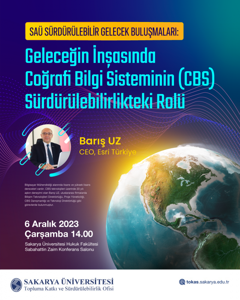 Etkinlik, 06.12.2023 tarihinde Sabahattin Zaim Konferans Salonu'nda saat 14:00'te gerçekleşecektir. "SAÜ Sürdürülebilir Gelecek Buluşmaları: Geleceğin İnşasında CBS'nin Sürdürülebilirlikteki Rolü" konulu etkinliğimize tüm personel ve öğrencilerimizi bekliyoruz.