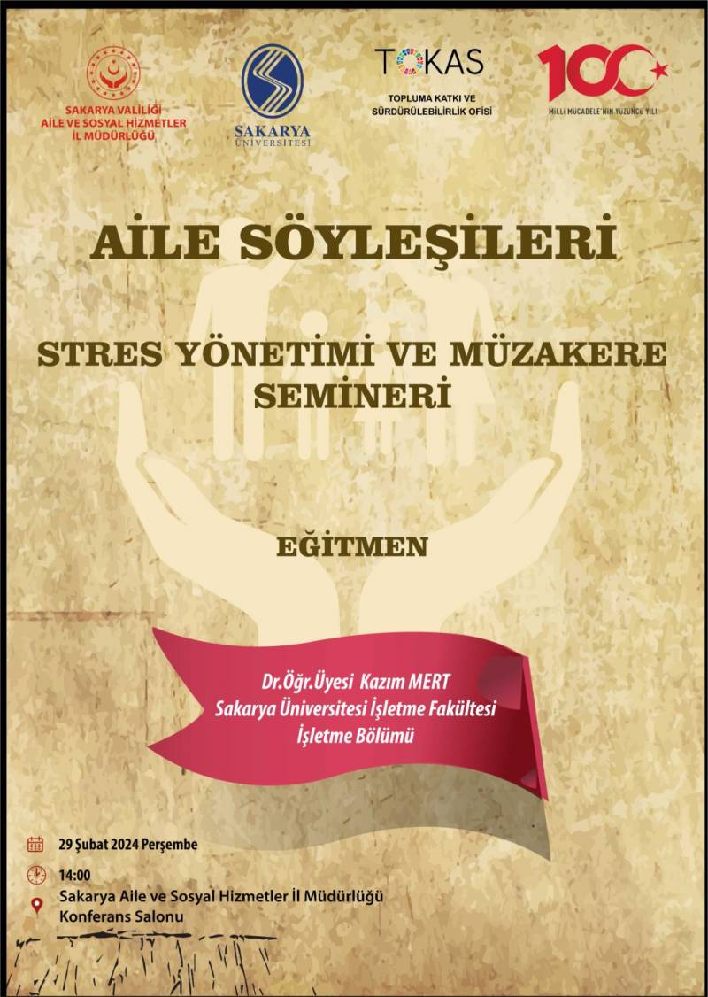 Topluma Katkı ve Sürdürülebilirlik Koordinatörlüğümüzün koordinasyonunda 29 Şubat Perşembe saat 14:00'te Sakarya Üniversitesi İşletme Fakültesi İşletme Bölümünden Dr. Öğr. Üyesi Kazım MERT hocamız tarafından Sakarya Aile ve Sosyal Hizmet İl Müdürlüğü personeline yönelik "Stres Yönetimi ve Müzakere Semineri" düzenlenecektir.