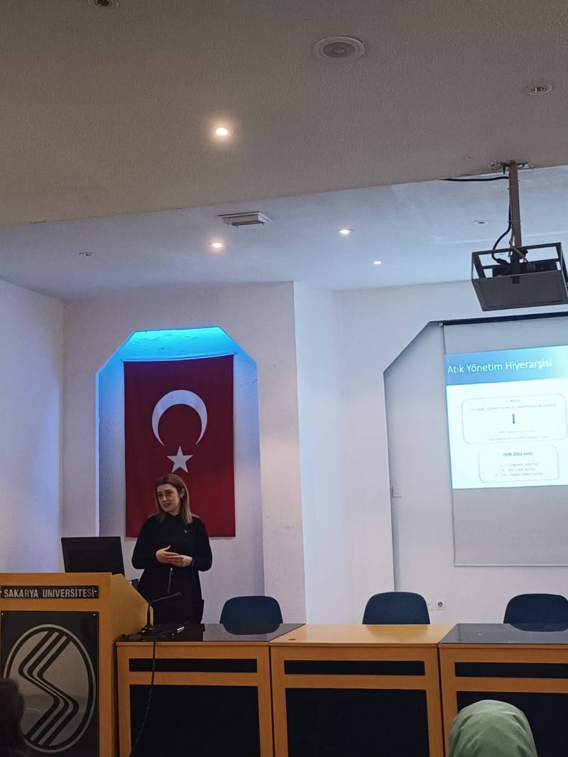 Sayın Yasemin ÇALIŞKAN, Ulusal mevzuat kapsamındaki yönetmelikler ve yönergelerin yanı sıra sıfır atık yönetmeliği ve bireysel atık yönetimi önerileri gibi konuları ele aldı. Ayrıca bitkisel atık yağ ve elektronik atık toplama için geliştirilen atık başvuru sistemi ile Sekay - Sakarya Entegre Katı Atık Yönetim Tesisi'nin önemi ve bu tesisin ayırma sistemi, biyogaz üretimi, kompost gübre çalışmaları ve ATY üretimi gibi faaliyetler hakkında değerli bilgiler paylaştı.