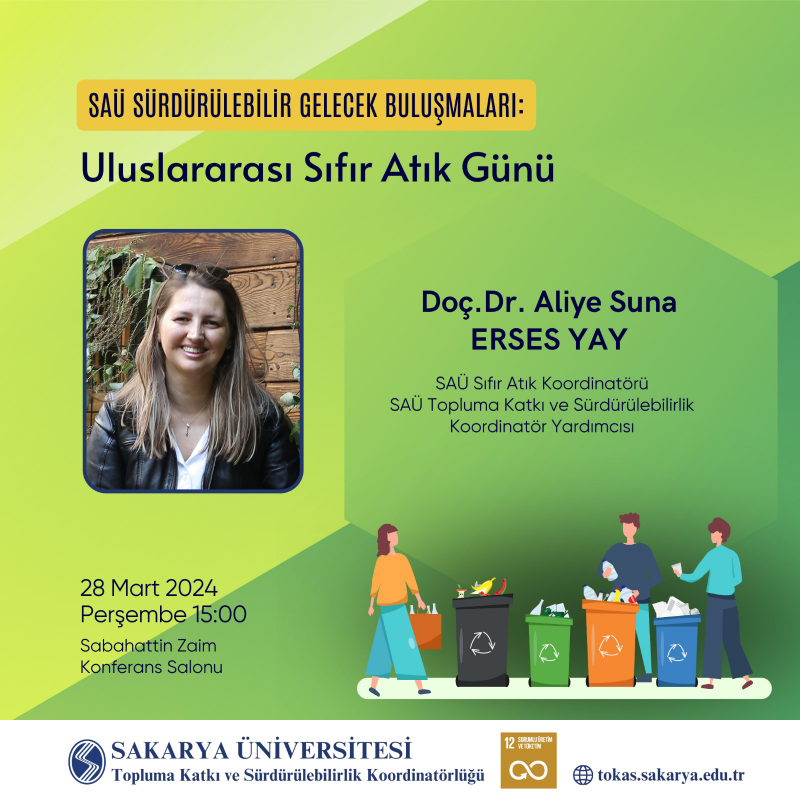 Sakarya Üniversitesi Sürdürülebilir Gelecek Buluşmaları kapsamında Sıfır Atık Koordinatörü ve Topluma Katkı ve Sürdürülebilirlik Koordinatör Yardımcısı Doç.Dr. Aliye Suna ERSES YAY’ı ağırlamaktan mutluluk duyuyoruz. Sürdürülebilir Kalkınma Amaçlarını (SKA) alanında uzman konuklar ile konuşmaya devam ediyoruz. SDG 12- Sorumlu Üretim ve Tüketim konusundaki etkinliğimiz, “SAÜ Sürdürülebilir Gelecek Buluşmaları: Uluslararası Sıfır Atık Günü” konulu söyleşi, 28.03.2024 tarihinde saat 15:00’te Sabahattin Zaim Konferans Salonunda gerçekleştirilecektir. Katılım Belgesi için kayıt formuna profildeki bağlantıdan ulaşabilirsiniz.