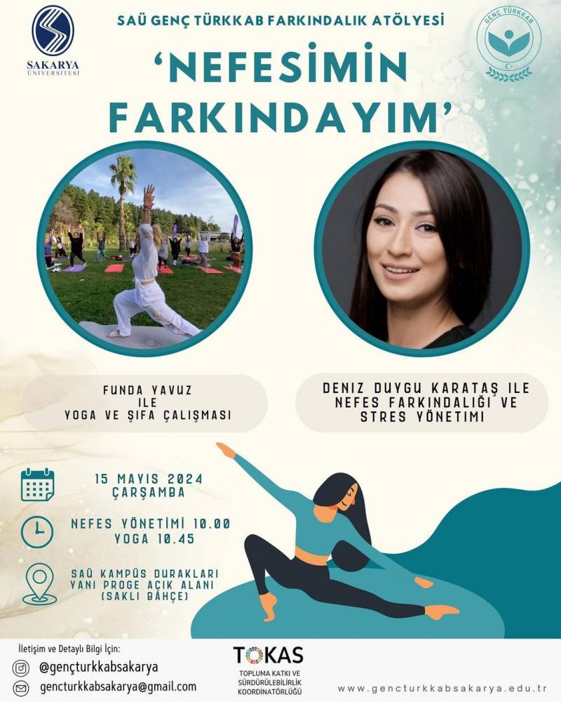 Genç Türkkab Sakarya Öğrenci Topluluğu tarafından Bahar Festivali kapsamında 15 Mayıs Çarşamba günü Saat:10.00’da düzenlenecek olan Nefesimin Farkındayım atölyesine tüm öğrencilerimizi bekleriz.