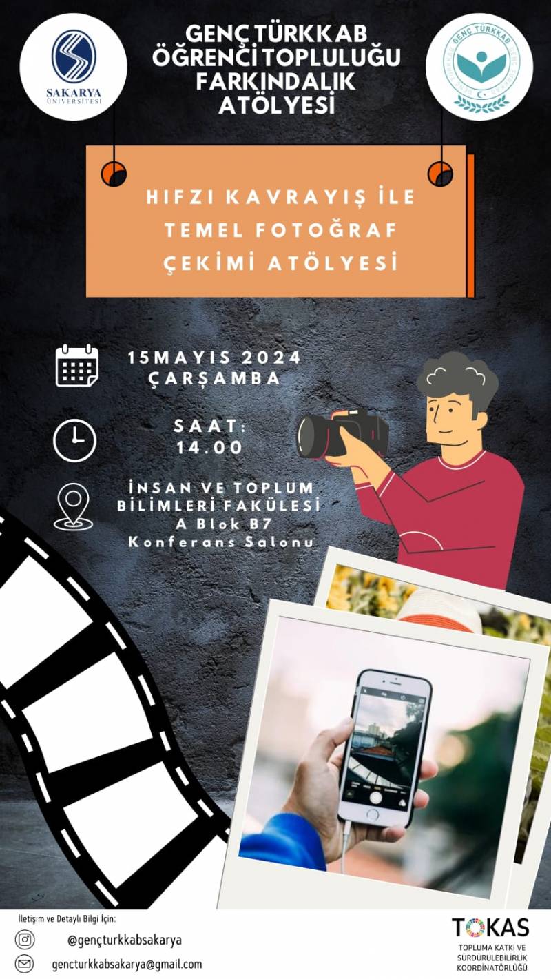 Sakarya Üniversitesi Genç Türkkab Öğrenci Topluluğu, Bahar Festivali kapsamında 15 Mayıs tarihinde saat 14:00'te İnsan ve Toplum Bilimleri Fakültesi A Blok B7 Konferans Salonunda “Hıfzı Kavrayış ile Temel Fotoğraf Çekimi Atölyesi” düzenleyecektir. Genç Türkkab Öğrenci Topluluğuna teşekkür ediyor ve tüm öğrencilerimizi atölyeye davet ediyoruz.