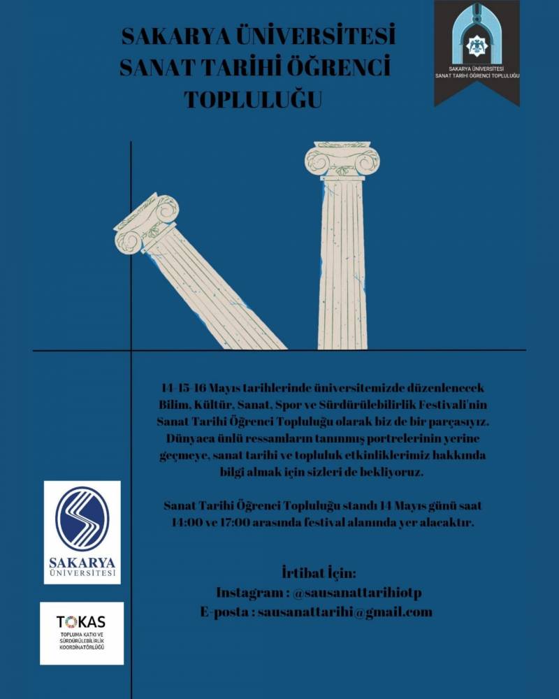 Sakarya Üniversitesi Sanat Tarihi Öğrenci Topluluğu, Bahar Festivali kapsamında 14 Mayıs tarihinde saat 14:00'te “Sanatın Yüzü Ol” isimli atölye düzenleyecektir. Sanat Tarihi Öğrenci Topluluğuna teşekkür ediyor ve tüm öğrencilerimizi atölyeye davet ediyoruz.