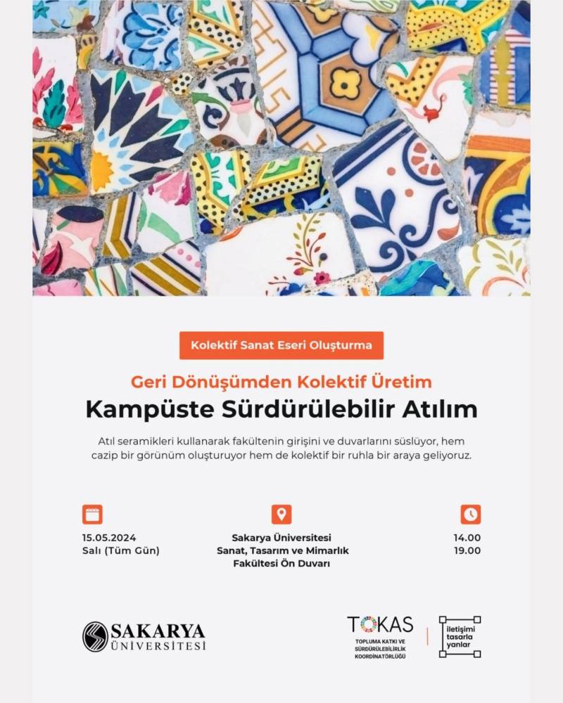 Sakarya Üniversitesi İletişimi Tasarlayanlar Öğrenci Topluluğu, Bahar Festivali kapsamında 15 Mayıs tarihinde “Kampüste Sürdürülebilir Atılım” isimli atölye düzenleyecektir. İletişimi Tasarlayanlar Öğrenci Topluluğuna teşekkür ediyor ve tüm öğrencilerimizi atölyeye davet ediyoruz.
