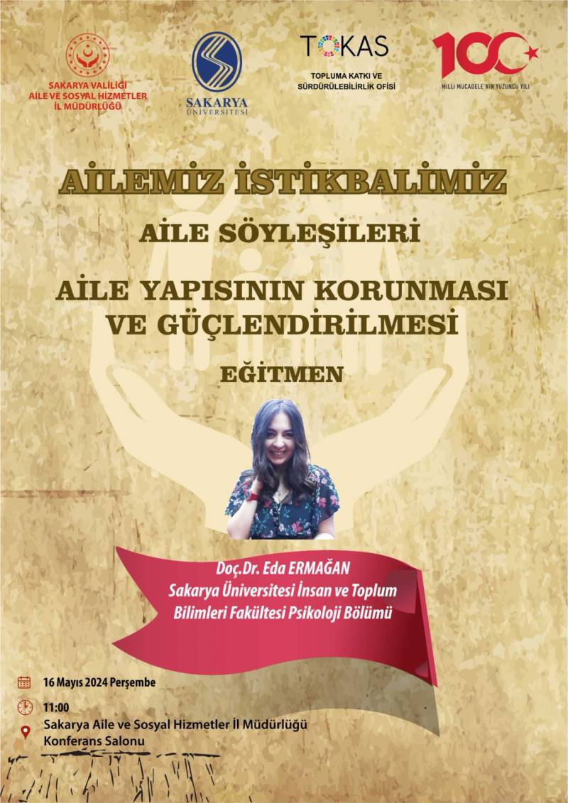 Sakarya Üniversitesi Topluma Katkı ve Sürdürülebilirlik Koordinatörlüğü organizasyonunda 16 Mayıs 2024 tarihinde Aile ve Sosyal Hizmetler İl Müdürlüğü Konferans Salon'unda "Ailenin Korunması ve Güçlendirilmesi" konulu seminer düzenlendi. Psikoloji Bölümü Öğretim Üyesi ve Sakarya Üniversitesi Uluslararası Ofis Koordinatörü Doç. Dr. Eda Ermağan Çağlar'ın konuşmacı olarak katıldığı programda katılımcılar özellikle Aile Bakanlığı Aile ve Toplum Hizmetleri Müdürlüğü faaliyetleri kapsamında da önemli bir hizmet alanını kapsayan Aile Yapısı ve Ailenin Güçlendirilmesi çalışmalarının psikolojik destek bağlamında nasıl desteklenmesi gerektiği konusunda bilgilendirildi.