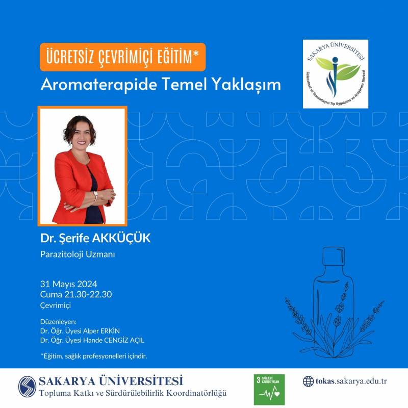 SAÜ Geleneksel ve Tamamlayıcı Tıp Uygulama ve Araştırma Merkezi ile Topluma Katkı ve Sürdürülebilirlik Koordinatörlüğü tarafından düzenlenen eğitime sağlık profesyonelleri davetlidir. Aromaterapide Temel Yaklaşım Eğitimi, 31 Mayıs 2024 tarihinde saat 21:30'da çevrimiçi olarak gerçekleştirilecektir.
