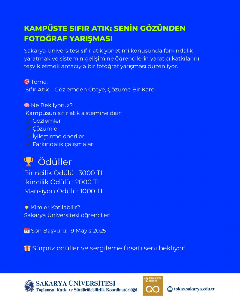 Sakarya Üniversitesi, sürdürülebilir bir gelecek ve çevre dostu kampüs hedefi doğrultusunda sıfır atık yönetimini aktif şekilde uygulamaktadır. Bu yarışmayla, öğrencilerin sıfır atık uygulamalarını sadece belgelemeleri değil; aynı zamanda bu sistemin daha iyi işlemesine katkı sağlayacak öneriler sunmaları teşvik edilmektedir.