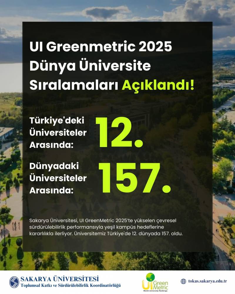 Sakarya Üniversitesi, sürdürülebilirlik stratejisini eğitim, araştırma, kampüs yönetimi ve toplumsal katkı alanlarında bütüncül bir yaklaşımla sürdürmektedir. Atık yönetimi, enerji verimliliği, yeşil binalar, ulaşım, su tasarrufu ve çevre eğitimi başlıklarında yürütülen çalışmalar, UI GreenMetric 2025 sonuçlarına doğrudan yansımıştır. Bu sonuçlarla birlikte üniversite, çevresel performansını artırma, karbon ayak izini azaltma ve Türkiye’nin sürdürülebilirlik hedeflerine katkı sunma konusundaki kararlılığını bir kez daha ortaya koymuştur.