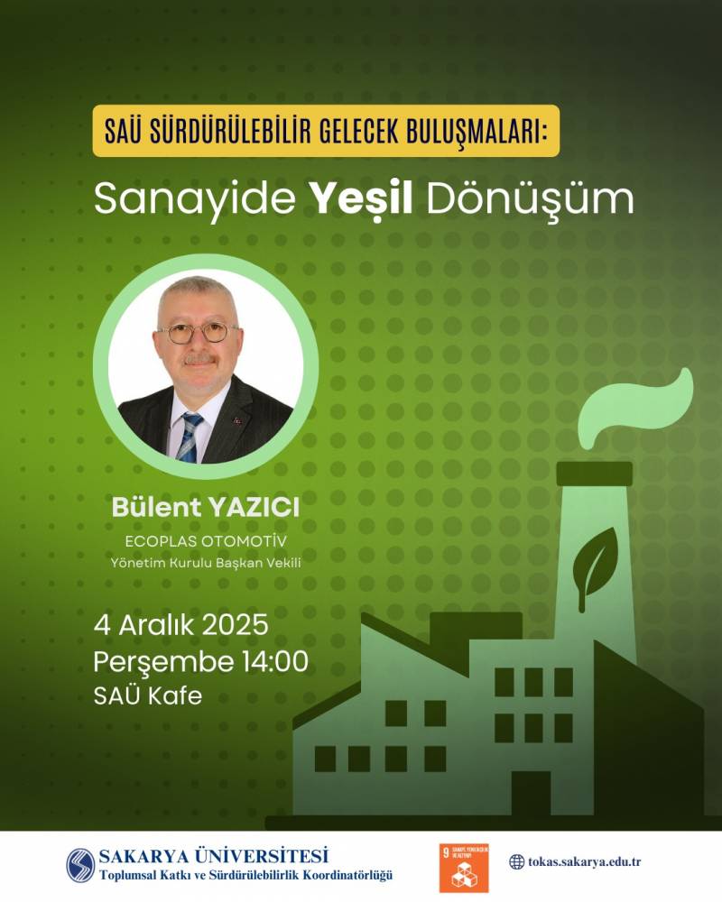 Sakarya Üniversitesi Toplumsal Katkı ve Sürdürülebilirlik Koordinatörlüğü (TOKAS) tarafından düzenlenen Sürdürülebilir Gelecek Buluşmaları, SKA 9: Sanayi, Yenilikçilik ve Altyapı temalı “SAÜ Sürdürülebilir Gelecek Buluşmaları: Sanayide Yeşil Dönüşüm” başlıklı etkinlikle gerçekleştirildi.